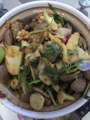 备好调料,油爆,放蚬子放香锅调料,放火锅丸子,青菜一起炒。觉得差不多熟了后放紫洋葱香菜和事先炒好的花生豆!出锅!开造!