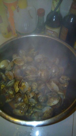 洗净花蛤,使之不带一点泥。同时做开水。