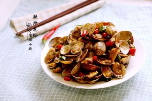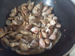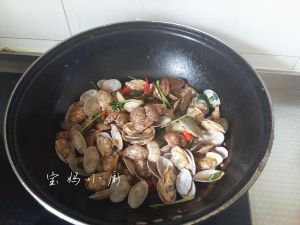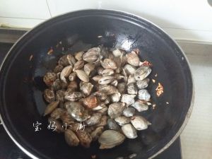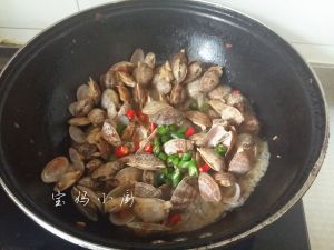 锅热后将葱姜蒜和干椒下锅爆香,倒入沥干水的花蛤,煸炒一会等花蛤慢慢开全口后,放入青椒,煸炒一下,加盐,鸡精少许。
