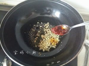 锅里放上油,葱,姜,蒜,红辣椒,爆炒