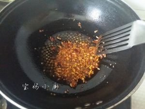 锅内入植物油,加入蒜末,小火煸香煸黄,加入豆瓣酱