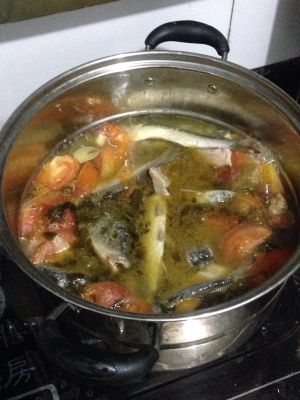 第四步锅烧热后加油,把鱼骨煎一下,放入生姜大蒜,葱白,小米椒,酸菜翻炒出香味,加辣椒粉翻炒,然后再加水烧开慢炖,加盐鸡精调味,待汤浓加入青红椒丁,把鱼片下锅烧开即可。最后撒上葱段上桌。