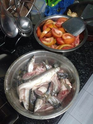 准备食材,鱼肉腌制15分钟左右,把番茄切成块状,不要切得太小,姜切片,大蒜拍碎,小葱切成颗粒状