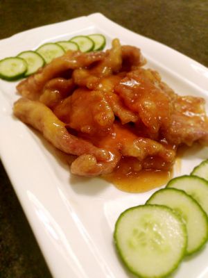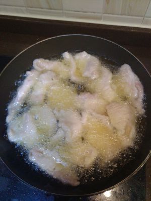 3️⃣ 热锅烧油至160度至筷子放入周围起泡,下肉片炸约3分钟至变色,捞出冷却;同样的方法复炸第二次,待略微变黄时,捞出冷却; 4️⃣ 热锅冷油,放入适量京葱丝爆香,加酱汁,中火翻炒片刻,待汁水变浓稠时,下炸好的肉翻炒均匀即可