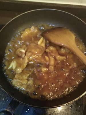另起油锅,放葱姜蒜爆香,我女儿不吃葱,所以我没有放,把调好的汁倒进去,煮开,倒入肉片炒匀就可以啦!