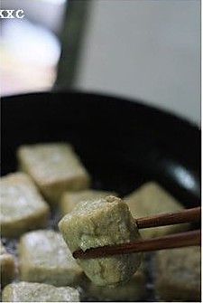 小火煎黄,翻面,再起大火煎酥,待臭豆腐呈金黄色时即可,准备好醮酱,起锅开吃。