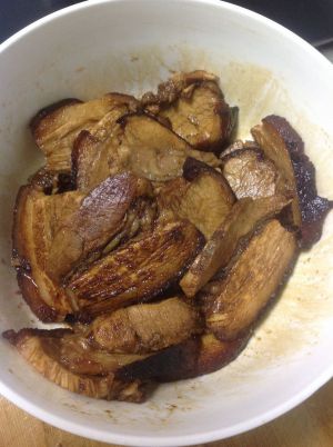 煎好的五花肉切成0.5cm厚的薄片。