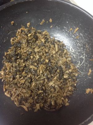 油烧热倒入蒜蓉,把梅菜放入,再把刚才腌五花肉的生抽放入一起翻炒一下即可