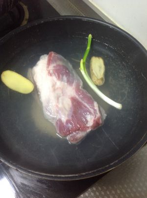 五花肉洗干净,冷水入锅,加料酒,姜片,煮至用筷子轻松戳肉即可