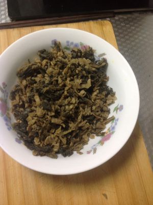 梅干菜提前一夜冷水浸泡后反复冲洗,切成小段,锅内放油放适量盐炒三五分钟