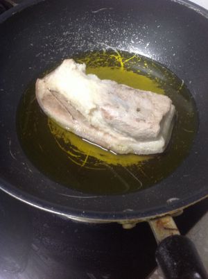 锅里放油,猪皮向下,盖锅盖,用小火将猪皮表面煎成金黄。注意一定要当心油溅出。
