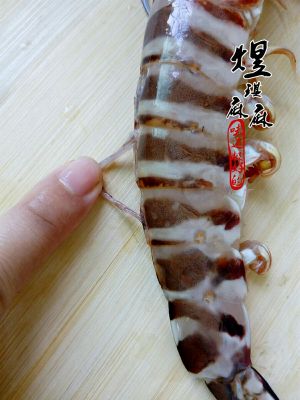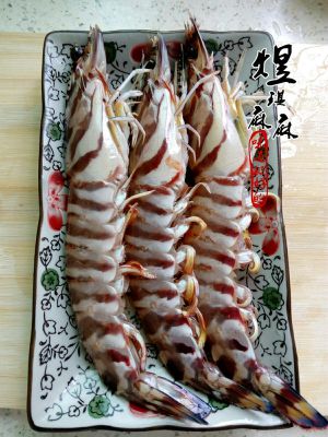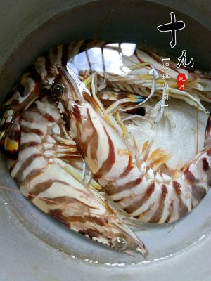 大虾洗净,用料酒,盐,葱,姜,淹半小时。