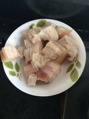五花肉条放入锅中,加清水煮透,捞出用清水冲一下。沥干,放入案板。切成长3厘米,宽3厘米,高3厘米左右的大块,放入盆中备用