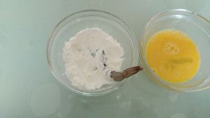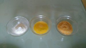 准备好淀粉,鸡蛋液和面包屑,分别盛装在碗内备用。