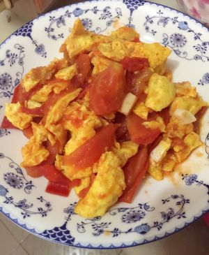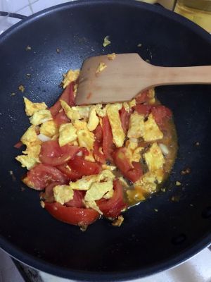 西红柿炒软后放入炒好的鸡蛋,一分钟后就可以出锅了,好了,盛一碗大米饭,吃吧
