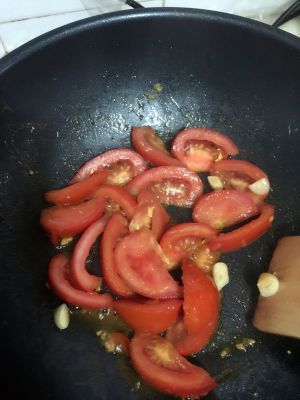 然后开火,锅内再放适量油一点点就可以,喜欢吃蒜的可以放一点蒜,然后放西红柿煸炒,火可以开大一点,炒到有点汤出来了最好,这时也可以少放几小勺清水炒,