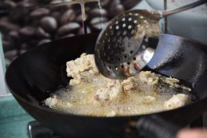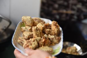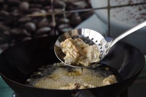 待面糊裹在排骨上,炸至表皮金黄后捞出。
