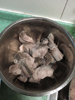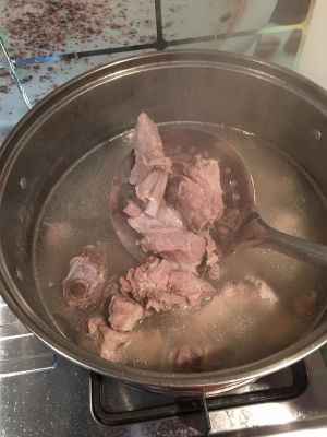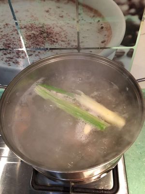 锅中水烧热放入刚刚洗过的排骨,加入葱姜蒜烧开后如果再有浮沫再继续撇除,先大火烧开几分钟后改小火慢慢炖煮。
