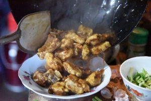锅中放油,油烧六成热(看着油锅冒烟了)把排骨一块一块地加入油锅。