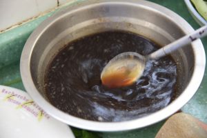 渐渐,油糖分离,形成底部糖周围油的状态,颜色变深。