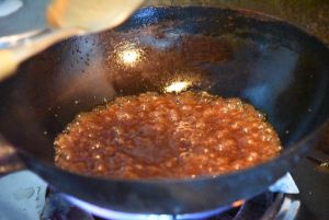 继续炒,炒至油糖完全融合,颜色越来越深,表面冒出些油烟。