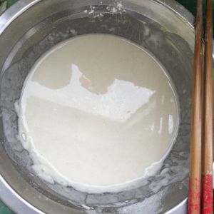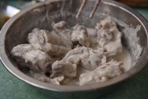 把排骨放入面糊中,让排骨均匀沾上面糊。面糊的浓稠度大约如图这样。