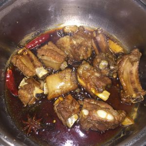 加酱油,醋,盐提味,再加水,没过排骨。大火烧开,炖五分钟,后转小火熬制至30分钟。