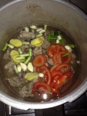锅内适量冷水,下排骨、番茄、姜片、整蒜、葱段、少量香菜段,水开后高压锅压8分钟左右,普通锅炖30分钟。