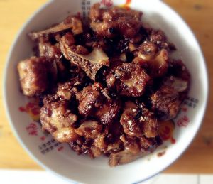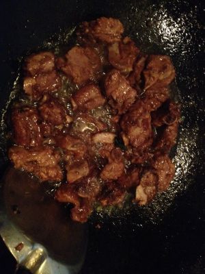 将多余油倒出,锅内留少许油,加入3汤匙白糖、少量肉汤,一点点盐(腌制时候已经加了盐,不要加多)加入排骨中小火煮5分钟。