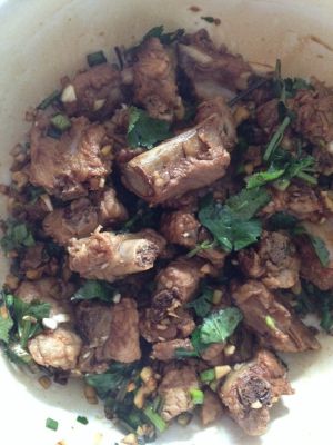 排骨捞起,加老抽、姜蒜、香菜、葱腌制30分钟。
