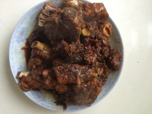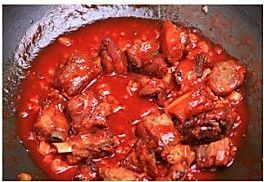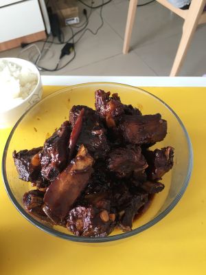 排骨,腌排骨的酱料,一碗排骨汤,三勺糖,放入锅中,大火收汁
