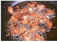 锅中做油,待油温到五成热时下入排骨,炸制成金黄色,捞出待用。