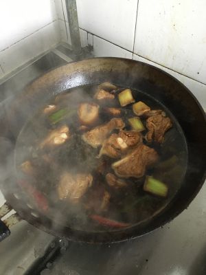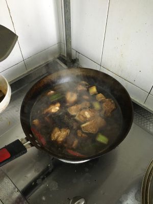 加水,放入葱、姜、八角、冰糖、陈醋、料酒、酱油、盐、香菇,翻炒几下,关小火焖四十分钟以上。
