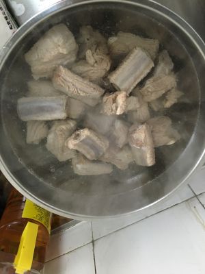 锅中做清水,排骨凉水下锅,焯出血沫捞出待用。