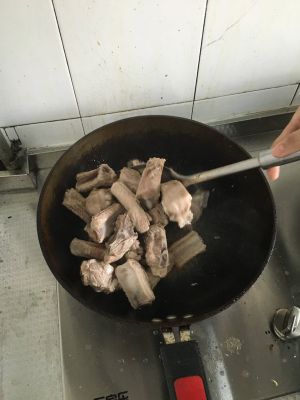 锅里放油,把焯过水的排骨下锅炒至上色。