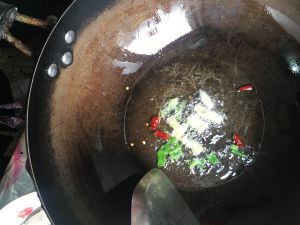 放入葱姜辣椒段煸炒