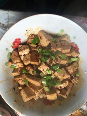 有香味后放入一勺花桥辣椒酱、翻出香味后倒入豆腐翻炒均匀。放盐调味即可