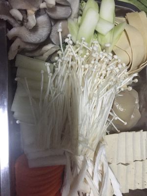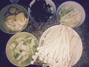所有喜欢的蔬菜都洗干净切好,豆腐、魔芋,蘑菇…一些菜需要提前焯水。