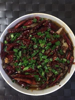 新起一锅入油,冷油加入干红辣椒、藤椒及麻椒,小火翻炒约4分钟离火翻搅,尚未完全炸熟时将起捞出平铺在盛出的鱼片上,将油继续加热约4、5分钟后泼在整盆鱼片上