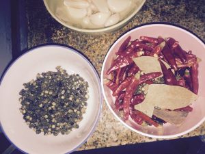 两份调料备用:1、八角、香叶、桂皮、花椒、藤椒、干红辣椒各少许;2、干红辣椒、花椒、藤椒稍多量