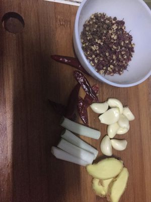 准备配料,大蒜,葱节姜片,红辣椒,郫县豆瓣酱,花椒,麻椒,火锅红油(或清油火锅料)。