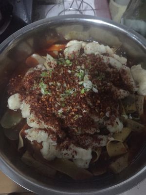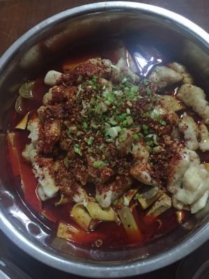 把菜按易熟程度下入汤料煮,煮好后全部装盆,锅里加开水下入腌好的鱼,不要搅动,龙利鱼好熟,开锅后基本就能捞了,嫩嫩的刚好吃,把鱼捞进刚煮好的菜盆上面,撒上辣椒面(根据个人口味需求确定量),撒上小葱。