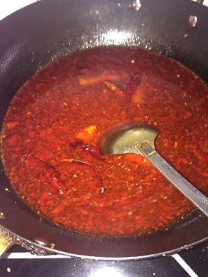 我们要起锅开火喽,油比平时炒菜要多三倍,油热后爆香葱姜蒜红干辣椒,三勺郫县豆瓣炒香,放清油火锅料2勺。火小一点,这个时候容易糊锅,炒出红油就可以加水了(开水哦)。汤开了加点生抽,尝一尝根据家人口味在确定放不放盐,我做的是三个人的量,没怎么放盐,水也加的不多应该有一升,因为要煮菜这个时候味道稍微要重一点。