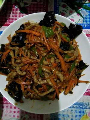 热锅放油,把葱蒜爆香,放入邳县豆瓣酱,翻炒!一次放入青椒丝红椒丝,木耳,放入冰花,肉丝,胡萝卜丝,火一定要硬,勾芡,放盐少许,一勺香油,出锅啦!
