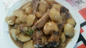 排骨炒的有点干了倒入清水莫过排骨炖煮,然后添加菌菇干菜类,排骨6分熟倒入土豆萝卜,等土豆熟了放点牛肉粉翻炒出锅