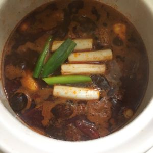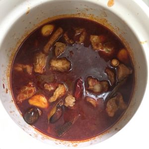 准备一口砂锅或是陶瓷锅,锅壁比较厚的炖锅,将炒锅里面的内容翻进来,再加水适量,加入五香大料