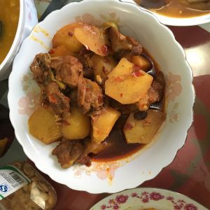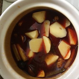 大火煮沸去浮沫,加盖,转小火炖40min;待锅底还留少许汤汁时,入土豆块,入盐和半碗水,大火煮沸转小火炖15min,至土豆绵软,入鸡精即可