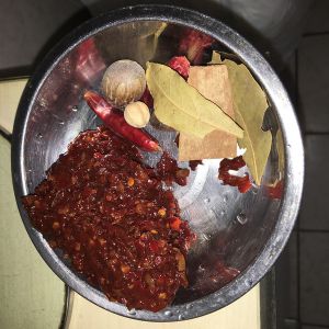 郫县豆瓣在菜板上剁碎,准备好五香大料