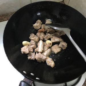 排骨加入料酒干姜用手抓着腌制一下去去腥味。烧一锅水,水开后排骨下锅焯一下,变色后就可以捞出。接着锅里油放干姜和蒜爆香,加入排骨翻炒一会儿