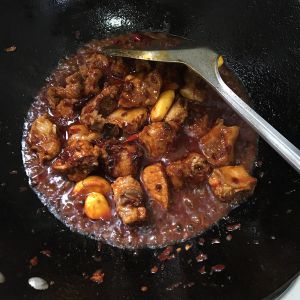 3起锅放入适量油,放入冰糖小火炒至融化,炒出糖色。